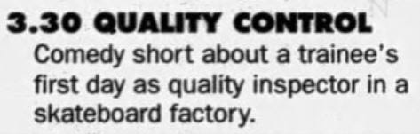The description the article gives on the short is also very interesting. The article says David played a youth trainee on his first day in a Leith sweatshop. But reviews and blurbs of the short's plot in newspapers say he was a job trainee who becomes a quality controller/inspector at a skateboard factory. It seems to me that a sweatshop and a skateboard factory are two very different places, but are they? Was that changed somehow between its showing at the College of Art degree show, or was it just the article writer's bad description?