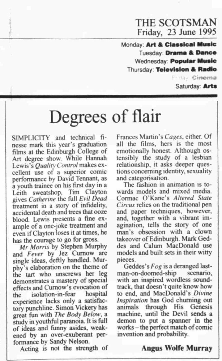 "Simplicity and technical finesse marked this year's graduation films at the Edinburgh College of Art degree show. While Hannah Lewis's Quality Control makes excellent use of a superior comic performance by David Tennant as a youth trainee on his first day in a Leith sweatshop…"